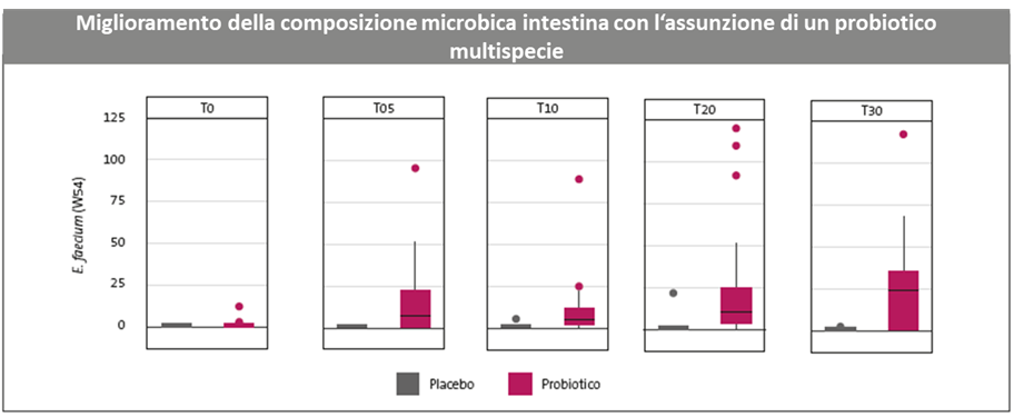Figura 4: La somministrazione giornaliera del probiotico multispecie con indicazione medica specifica per 30 giorni ha portato a un aumento sostenuto di Enterococcus faecium.14
