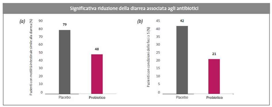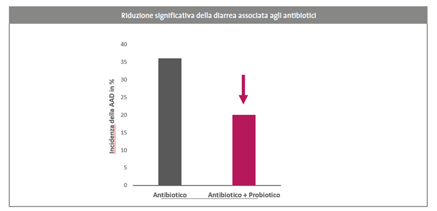 Una recente metanalisi Cochrane (2025) 12 basata su oltre 13 000 partecipanti ha mostrato che la co-somministrazione di probiotici può ridurre di circa il 50 % il rischio di Clostridioides difficile infection (CDI) nei pazienti trattati con antibiotici, suggerendo un beneficio clinico significativo nella prevenzione di CDI oltre alla diarrea associata agli antibiotici. Numerose evidenze cliniche indicano che l’assunzione del probiotico multispecie di indicazione specifica (Lactobacillus acidophilus W55, Lactobacillus acidophilus W37, Lactobacillus plantarum W1, Bifidobacterium lactis W51, Enterococcus faecium W54, Lactobacillus paracasei W20, Lactobacillus rhamnosus W71, Lactobacillus salivarius W24, Lactobacillus plantarum W62, Bifidobacterium bifidum W23) può contribuire in modo significativo nella prevenzione delle complicanze gastrointestinali associate alla terapia antibiotica. 4,7,13